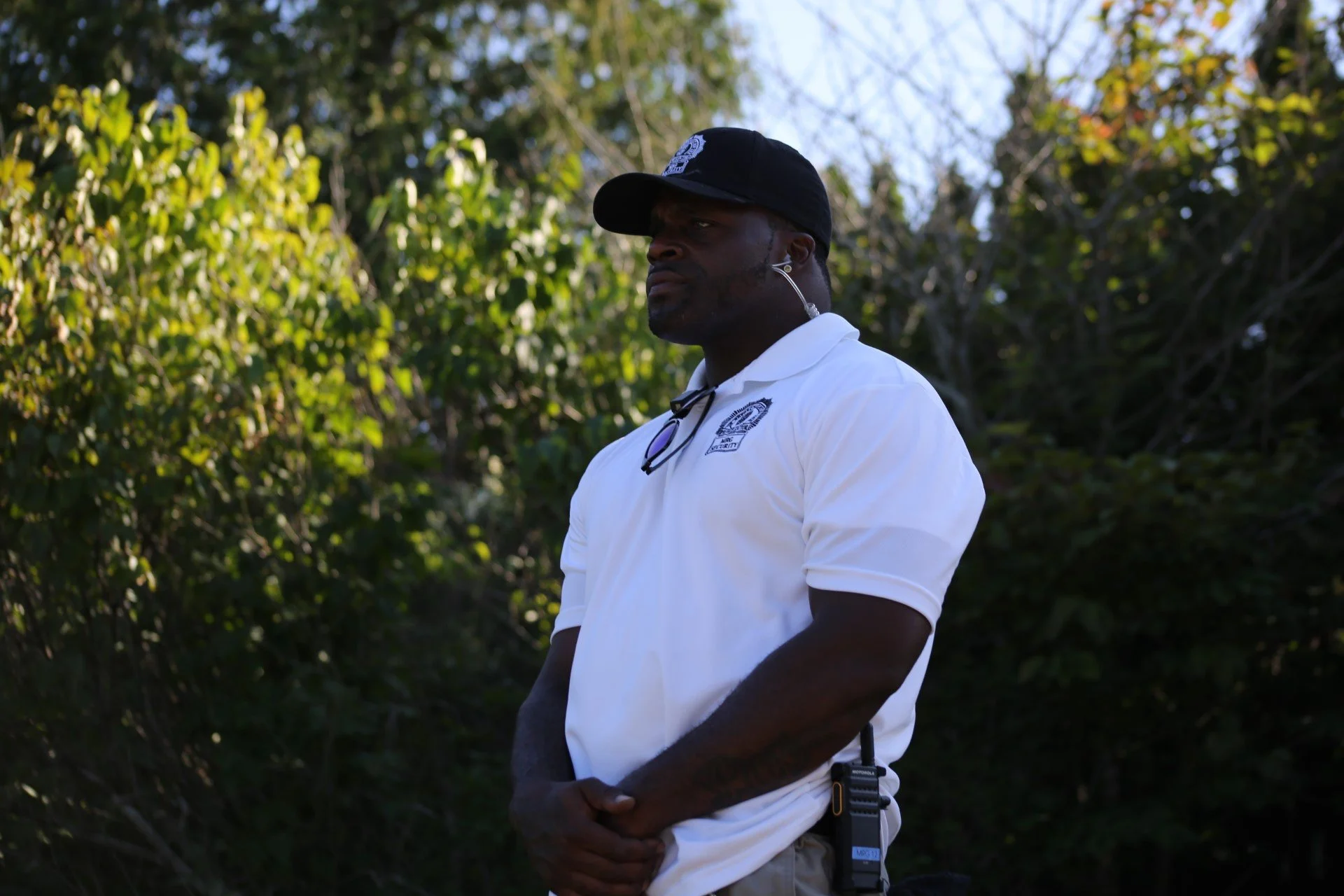 A security guard wearing a black uniform, hat, sunglasses, and a wristwatch stands in front of a parade float with red, white, and blue decorations and spectators in the background.